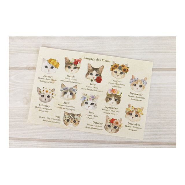 きれいな花飾りを頭にのせたネコたちが描かれた「fleurs&chats」のポストカード。